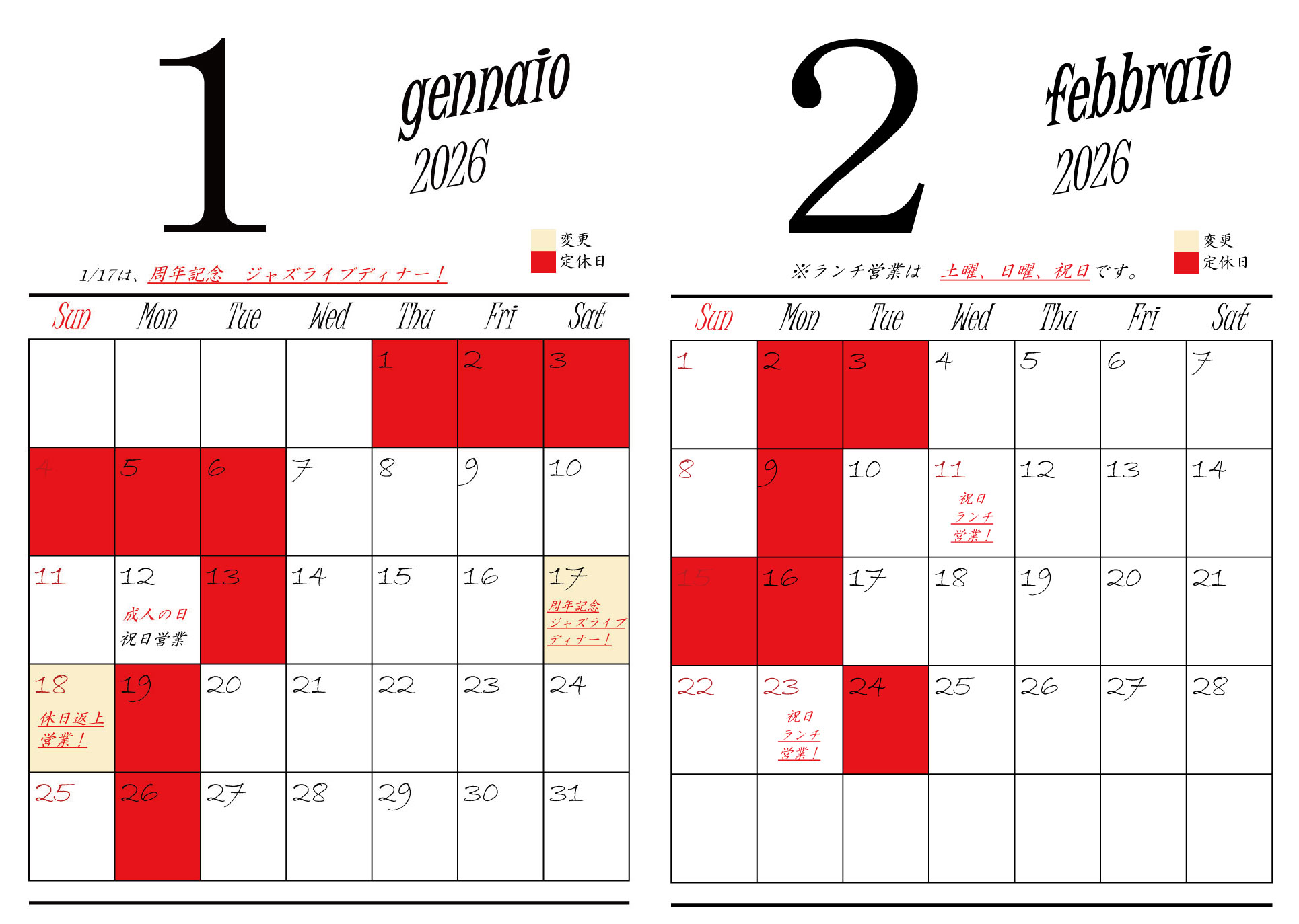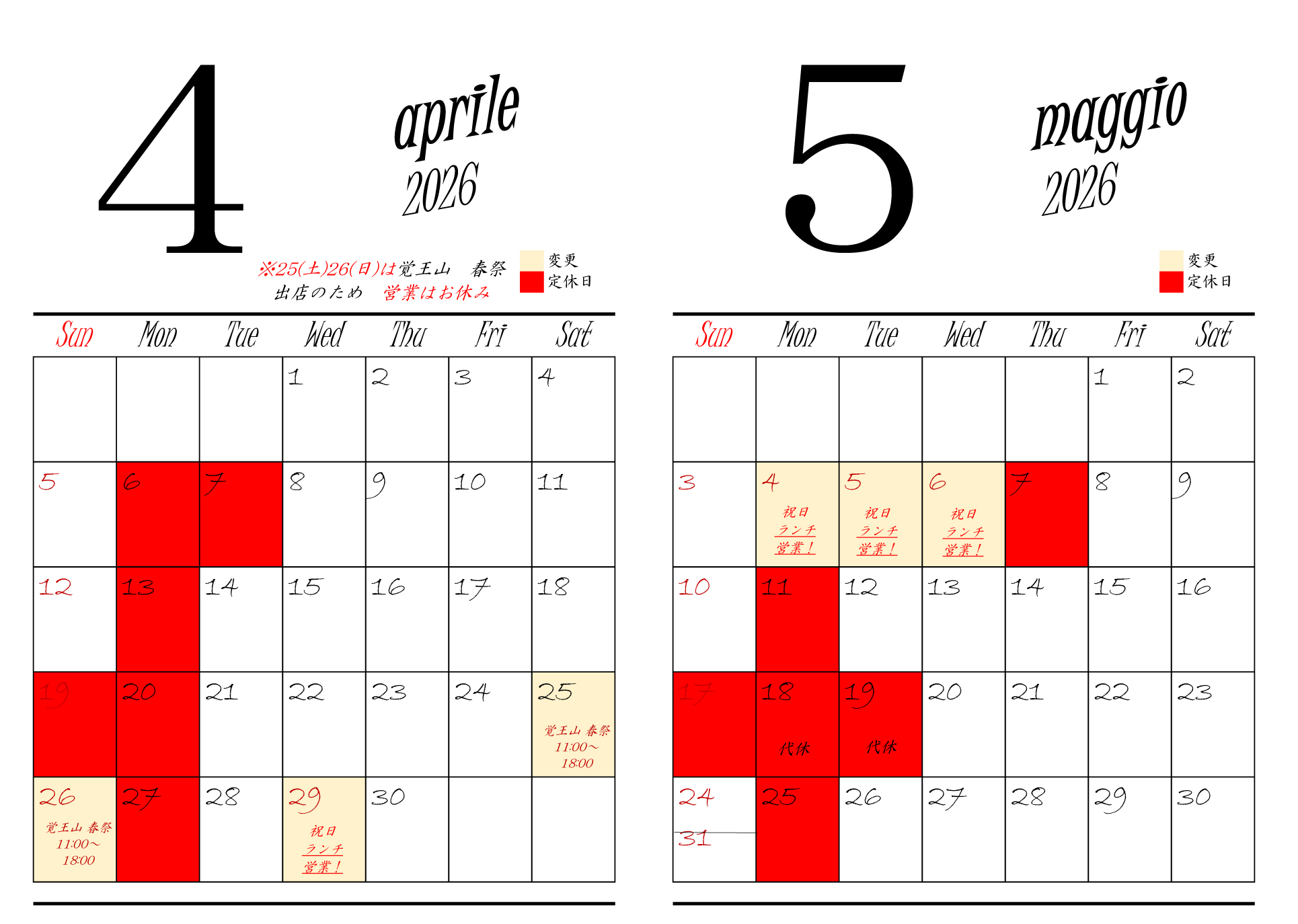 - ※ランチは土曜、日曜、祝日のみ