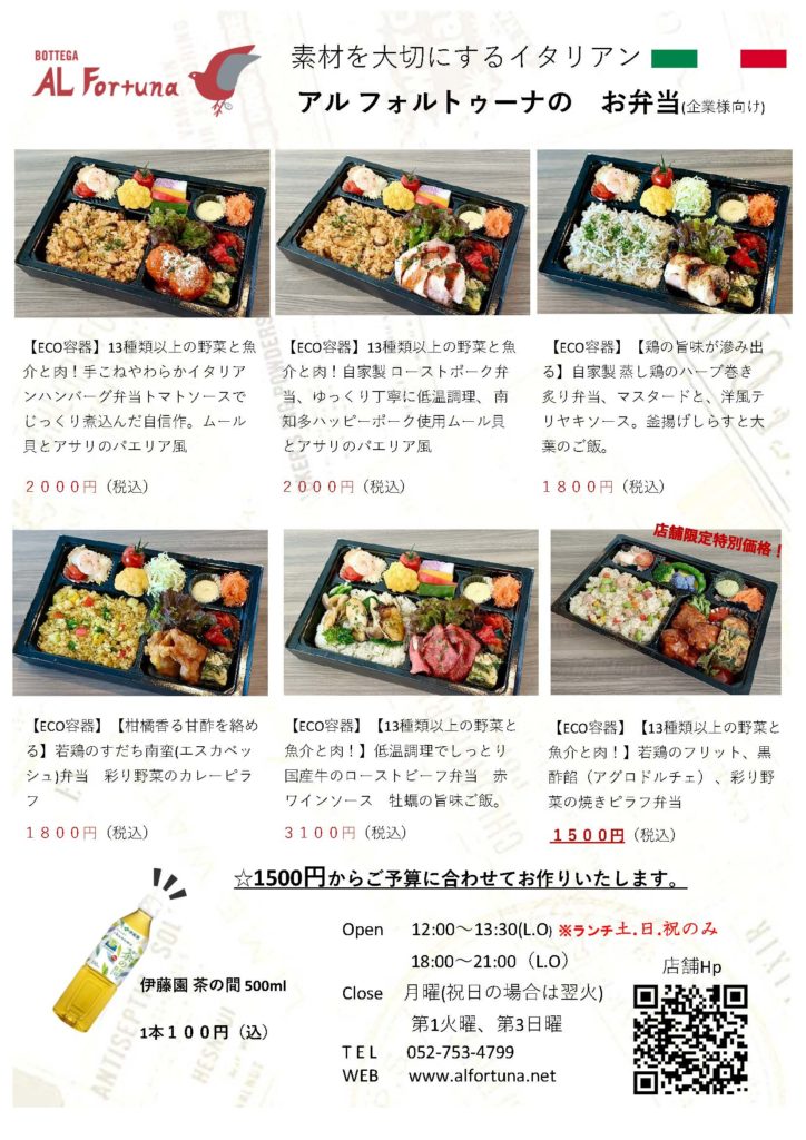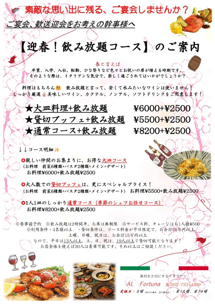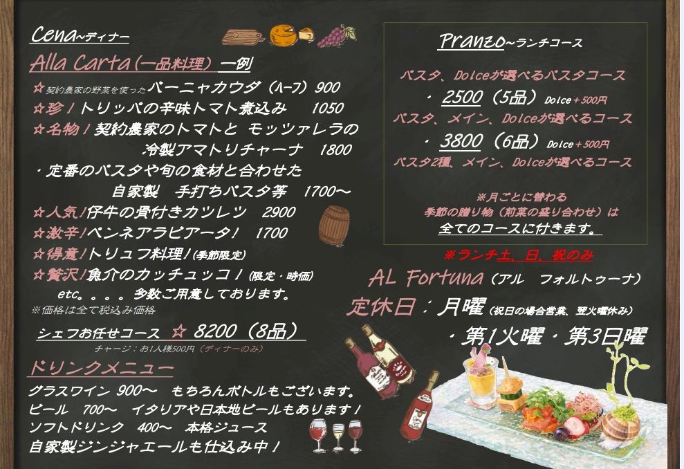 地下鉄「覚王山駅」すぐの「AL Fortuna(アルフォルトゥーナ)」の 月ごとに変わるスペシャルランチコースは2,500円(税込)3,800円(税込)7,700円(税込)の3種類からお楽しみ頂けます。